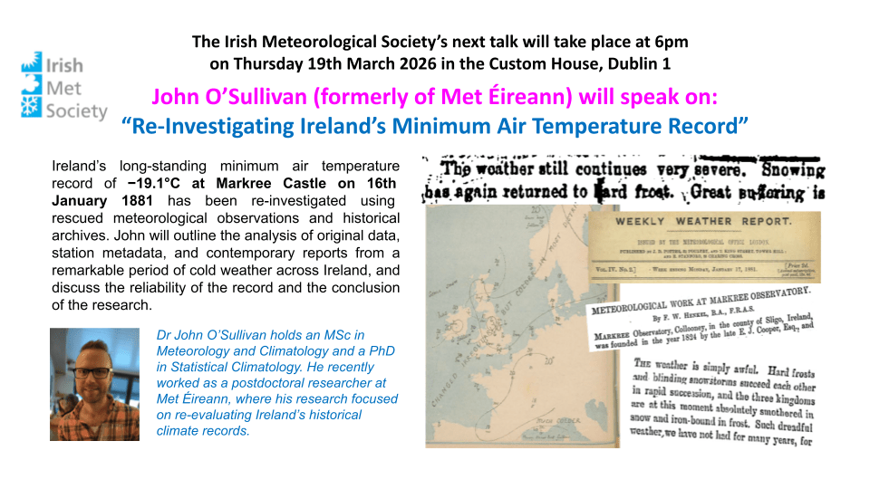 On Thursday 19th March, Dr John O’Sullivan (formerly a postdoctoral researcher at Met Éireann) will give the second IMS talk of 2026. In “Re-Investigating Ireland’s Minimum Air Temperature Record“, John will outline the team’s analysis of original data, station metadata, and contemporary reports from a remarkable period of cold weather across Ireland, and discuss the reliability of the record and the conclusion of the research. This talk will take place at the Custom House.
